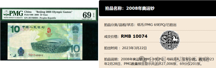 也即是上头这张08年10元奥运钞,在之前的当代钱币春拍中,以10074元的价钱被拍出。这张奥运钞最特别的,即是它的69分的评级分了,据统计,在那时拍出的时候,PMG数目发达闪现共送评了27,006张,69分的只是只须201张。